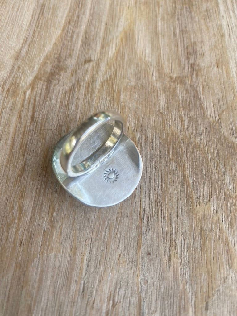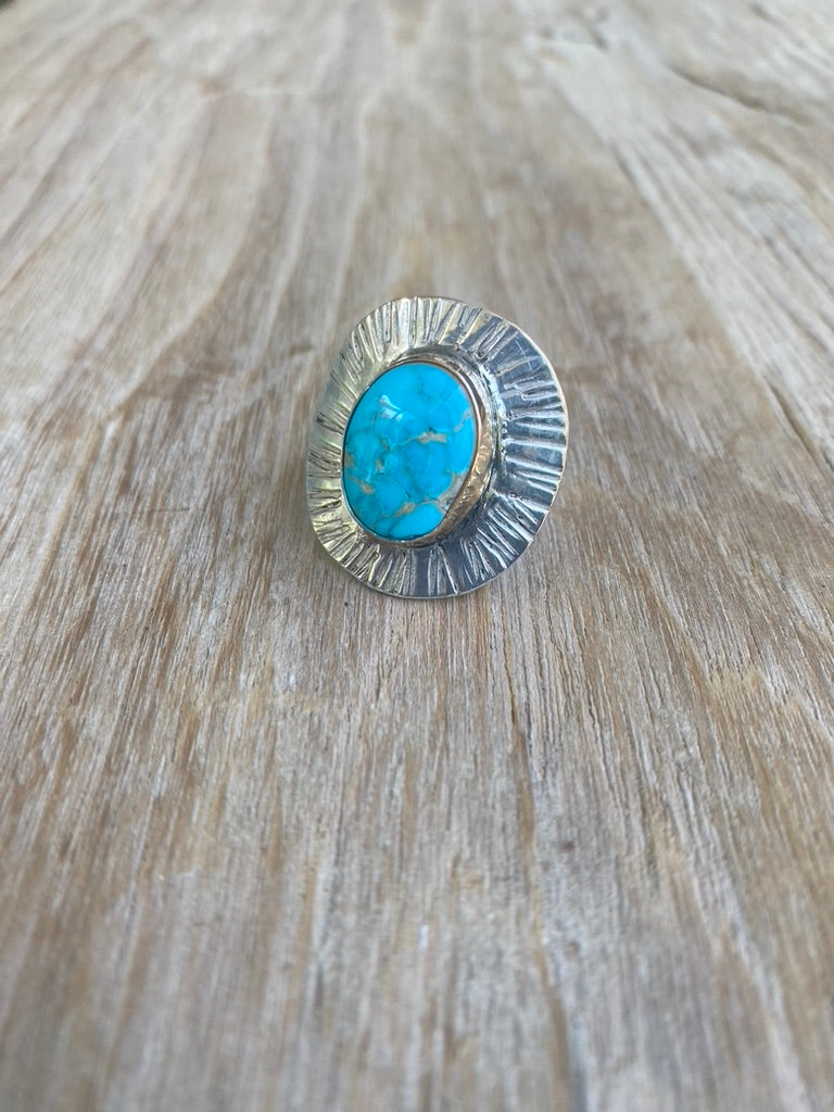 gman Turquoise surrounded by gold fill bezel, Sterling silver table and shank